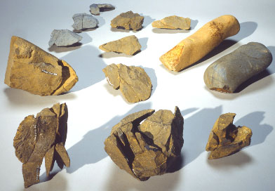写真2 環状ブロックから出土した ガラス質黒色安山岩製等の石器と叩き石 |